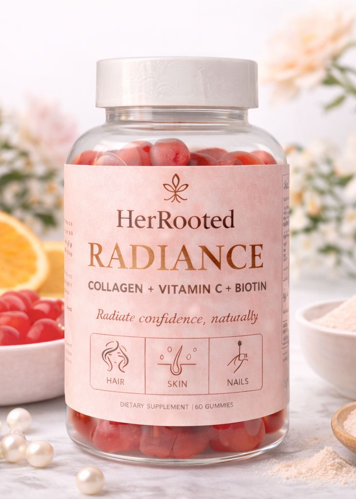 Glow from the inside out with HerRooted Radiance, a daily beauty gummy thoughtfully designed to support healthy hair, glowing skin, and strong nails. These delicious gummies make it easy to stay consistent while nourishing your body with beauty-supporting nutrients women actually need.